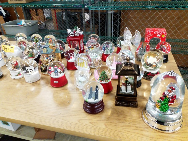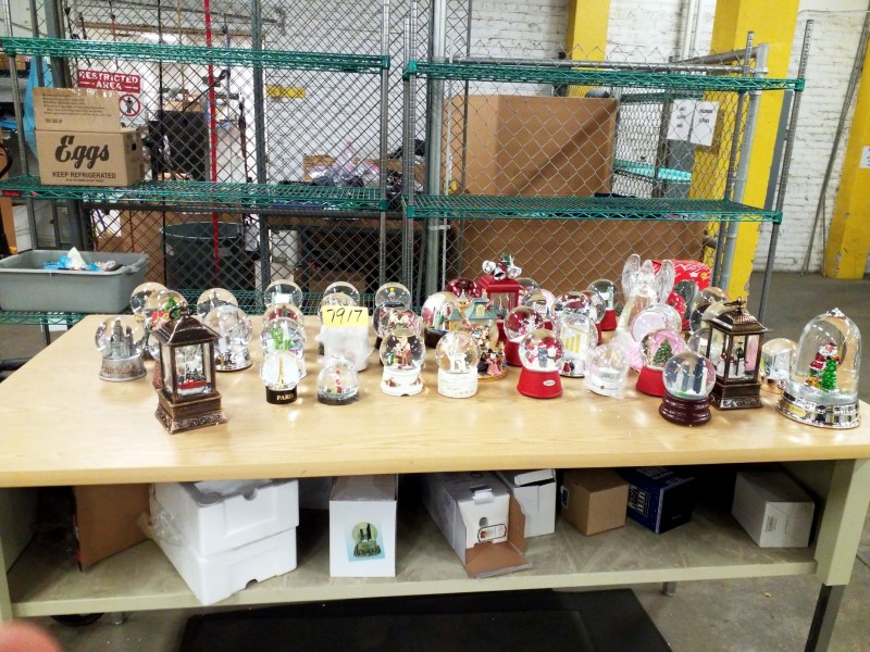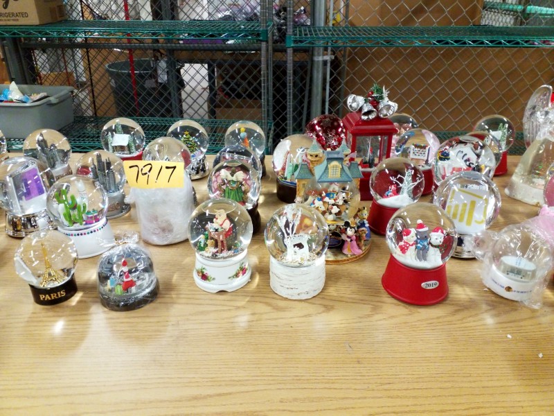 Description: Table lot consisting of miscellaneous snow globes and other. This lot will require the winning bidder upon pick/up to bring with them their own boxes, bins, and packing material for this lot. Warehouse staff will not provide these items when picking this lot up.