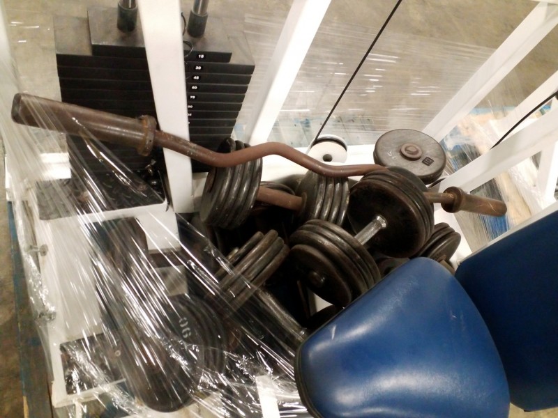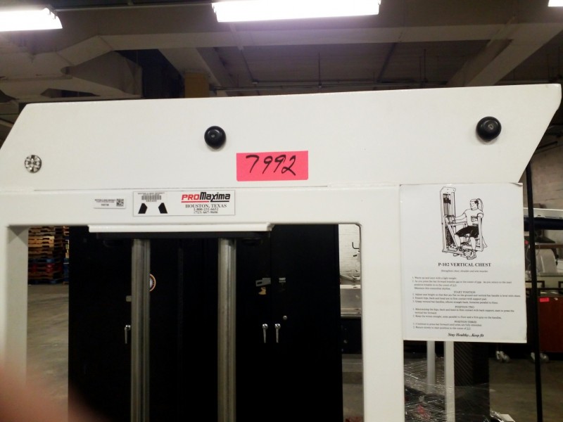 Description: 1 each Pro Maxima verticle chest workout machine with miscellaneous dumbells and a curl bar.