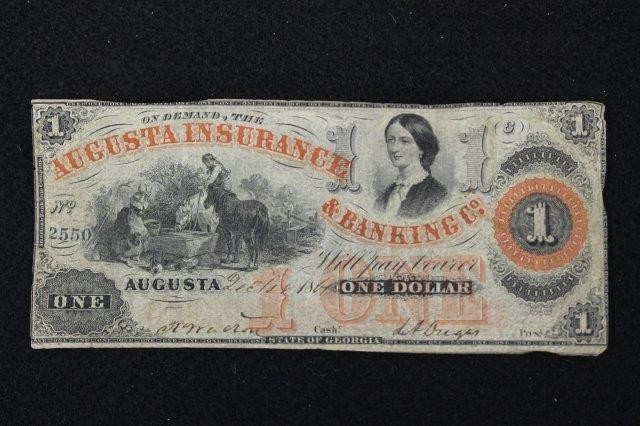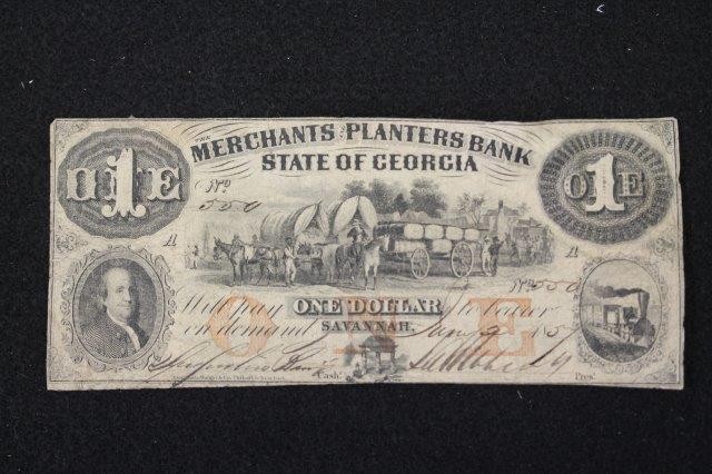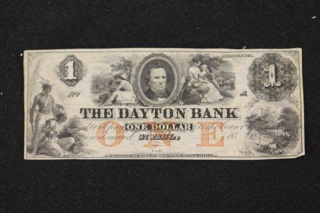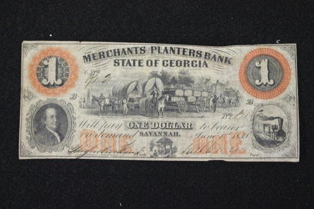 4- ONE DOLLAR BROKEN BANK NOTES: 1857,1859 MERCHANTS PLANTERS BANK STATE OF GEORGIA, AGUSTA INSURANCE AND BANKING COMPANY, UNUSED THE DAYTON BANK OF ST PAUL MINN.