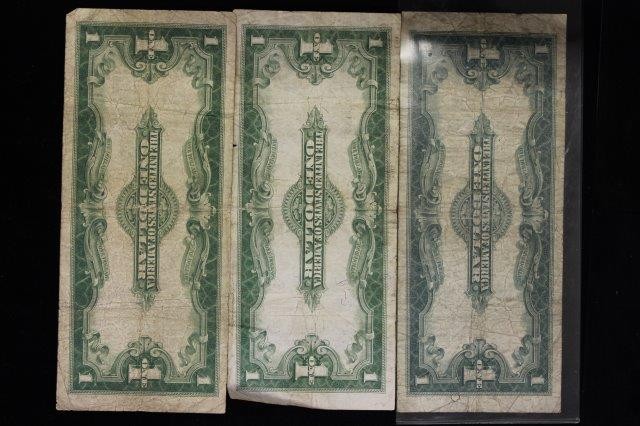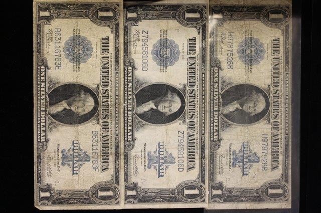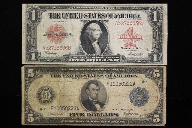 5- LARGE SIZE U.S. NOTES; 3- 1923 ONE DOLLAR BLUE SEAL SILVER CERTIFICATES,1923 ONE DOLLAR RED SEAL,1914 FIVE DOLLAR FEDERAL RESERVE NOTE