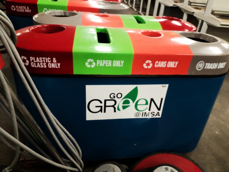 Description: Lot consisting of 2 each Go Green recycling containers for Plastic & Glass, Paper, Cans and Trash.
