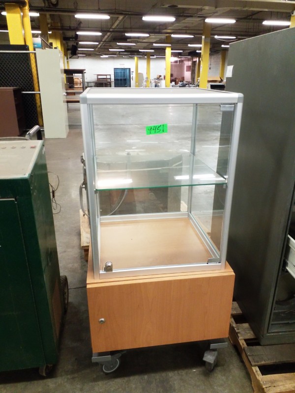 Description: 1 each display cabinet on wheels. No keys are available for this unit and the glass case is locked.