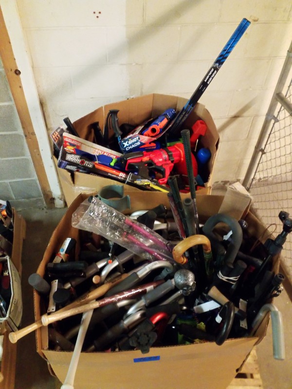 Description: 1 each pallet consisting of miscellaneous TSA items. If the pallet you win has bins on it you will need to remove the contents and leave the bins at the warehouse. Therefore the winning bidder will need to bring with them their own containers, bins and/or other to remove the contents and leave the bins behind.