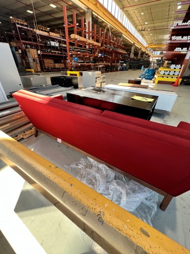 1 RED FABRIC SOFA, MEASREMENTS: 6FT 7 IN. L X 2 FT. 5 IN. W X 2 FT. 8 IN. T, CONDITIN UNKNOWN