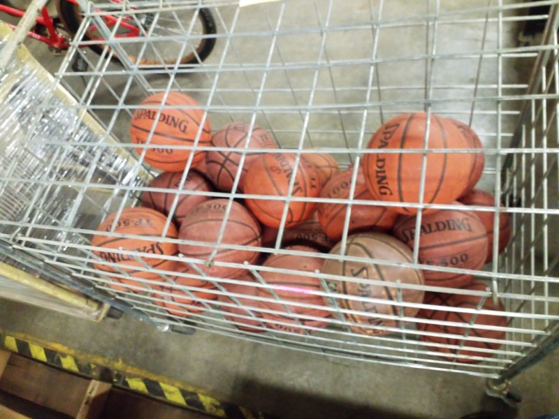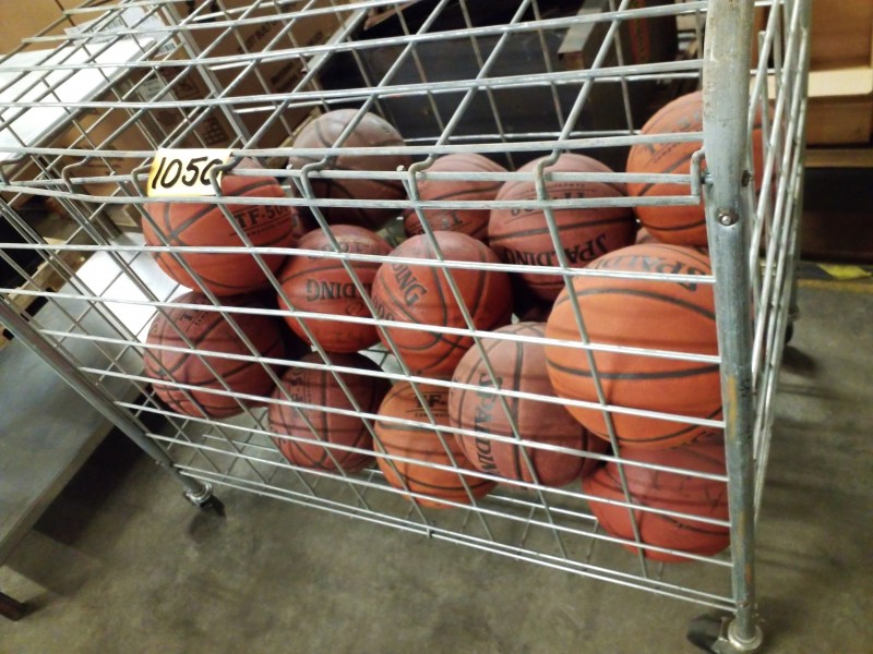 Description: 1 Each. Rolling cage w/ Various Basketballs