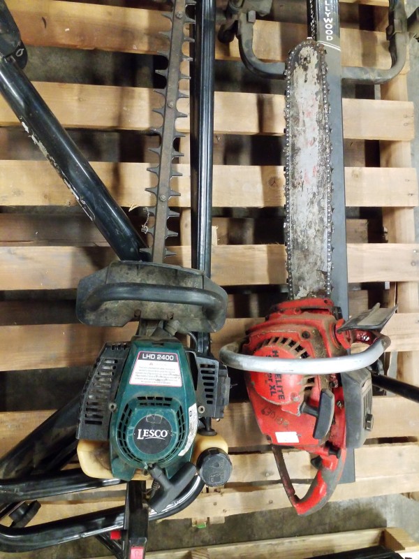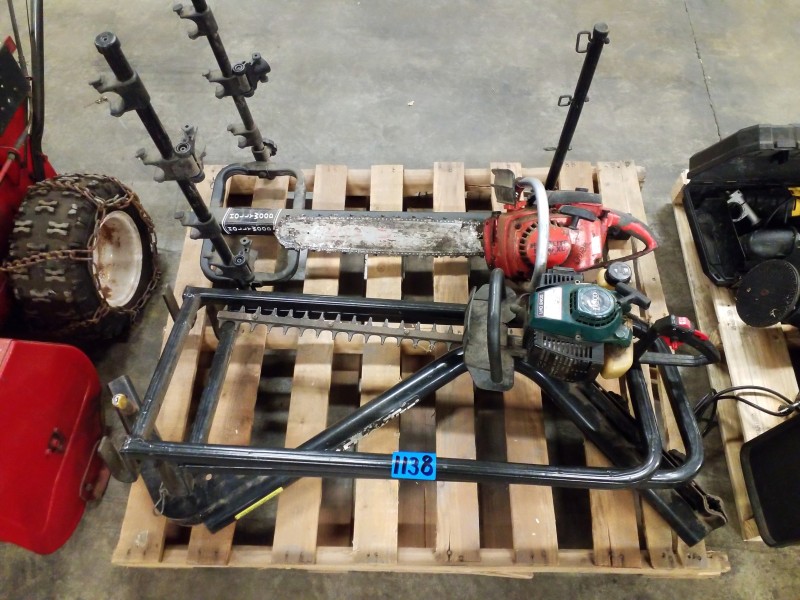 Description: 1 PALLET. CONSISTING OF A BIKE RACK - CHAINSAW - HEDGE TRIMMER