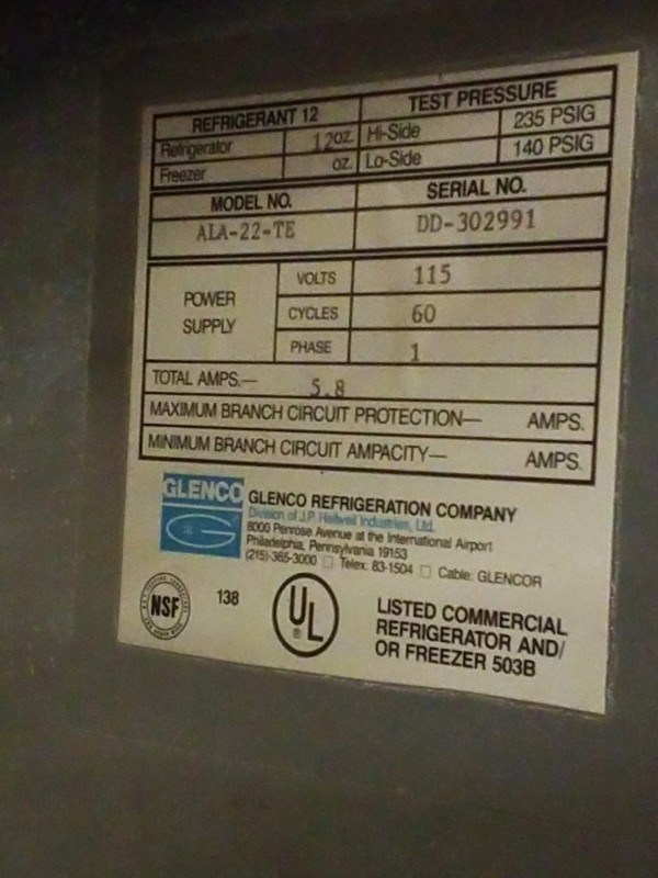 Description: 1 EACH. GLENCO REFRIGERATOR