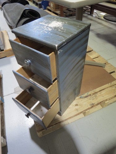LOT CONTAINS: (1) TABLE, 24 X 30 IN., (1) BLUE STAND WITH 3 DRAWERS, 13 X 13 X 26 IN., CONDITION UNKNOWN