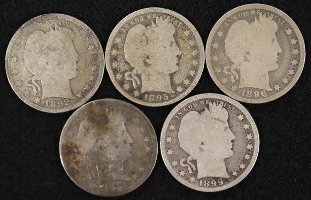 BARBER COINAGE; 11 BARBER HALF DOLLARS: 1897, 1906D, 1907, 1907D, 3-1908O, 3-1908S, 1912D, 13 BARBER QUARTERS: 1892, 1895, 1896, 1897, 1899, 1900, 1901, 1904, 1906, 1907, 1908D, 1914, AND ONE NO DATE, BARBER DIME 1914