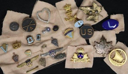 31 MISC PINS INCLUDING; 10K 50 YR PIN 2.2G, 14K STICK PIN 1.3G INC STONE, STERLING TRUMPET, STER. SPOON, STER. /ENAMELED VIKING SHIP, 2 JUNIOR BIRDMEN OF AMERICA, 1930S LONE WOLF TRIBE PIN, 1934 CHICAGO WORLDS FAIR, AND 22 MISC PINS