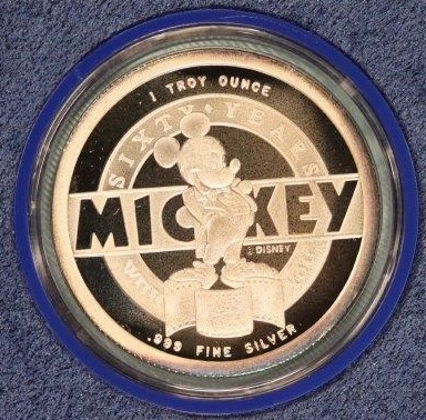 MICKEY MOUSE 60 YEARS ONE OZ .999 FINE SILVER, SNOW WHITE 50TH ANNIVERSARY HALF OUNCE .999 FINE SILVER