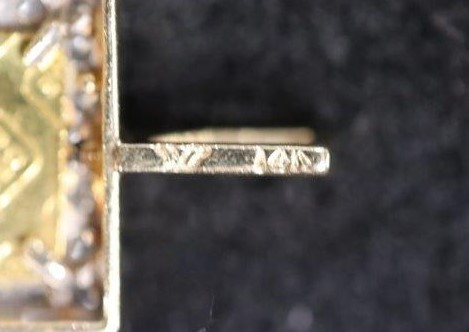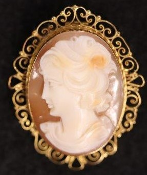 MISC GOLD JEWELRY; SHELL CAMEO 18K BEZEL 5.3G TL WT, 14K YELLOW GOLD HORN PIN 7.3G, 14K YELLOW GOLD CROSS 1.9G, CREDIT SUISSE 1G .999 FINE GOLD IN 14K/DIA BEZEL 2.1G [3.1G TL WT OF PENDANT]