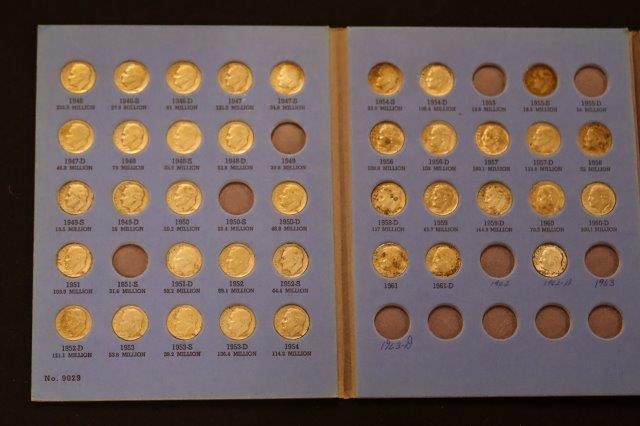 DIME COLLECTIONS; WHITMAN BLUE BOOK OF MERCURY DIMES: 41 MIXED DATES AND MINT MARKS, ROOSEVELT BOOKS: GREEN BOOK 44 PRE 1965 ASSORTED DATES AND MINT MARKS AND 5 CLAD, BLUE WHITMAN BOOK 38 MIXED DATES AND MINT MARKS ALL PRE 65