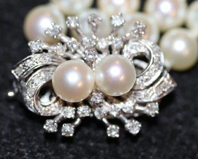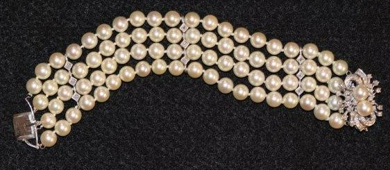 14K WHITE GOLD LADY'S HAND ASSEMBLED BEAD BRACELET: CONTAINS 1 UNIFORM FOUR STRAND PEARL BRACELET 7.5" 14K WHITE GOLD CLASP CONTAINING .80 LIGHT CREAM COLORED AKOYA CULTURED PEARLS 7.0MM, 47 PRONG SET SINGLE CUT DIAMONDS APPROX WT 0.77CT. 2 LIGHT CREAM COLORED AKOYA CULTURED PEARLS 7.1MM. TL WT OF BRACELET 36.78DWT.