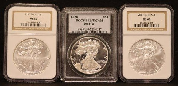 3 GRADED SILVER EAGLES; NGC 1996 MS 67, PGCS 2001-W PR69DCAM, NGC 2005MS 69