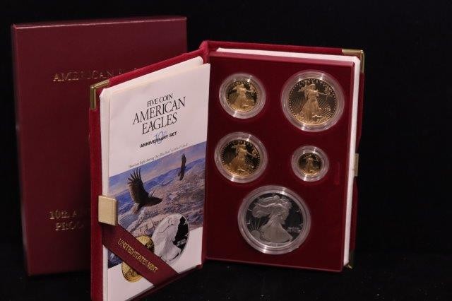 1995 FIVE COIN AMERICAN EAGLE TENTH ANNIVERSARY SET CONTAINING: ONE OUNCE, HALF OUNCE, QUARTER OUNCE, TENTH OUNCE GOLD PROOF COINS, 1995 SILVER EAGLE ONE OUNCE SILVER PROOF
