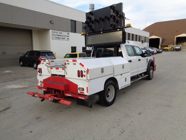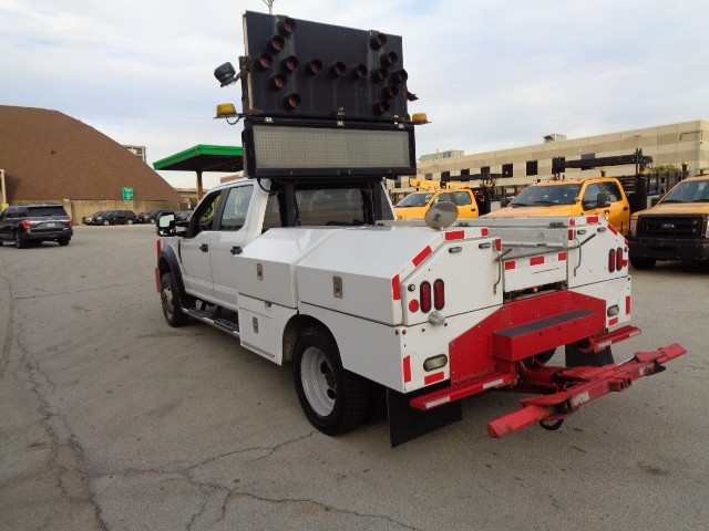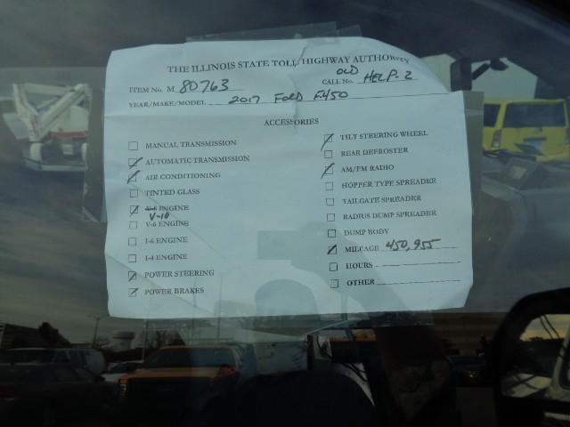 ILLINOIS TOLLWAY 2017 FORD F450 UTILITY BODY SERVICE TRUCK , CREW CAB 6.8L V10 ENGINE, POWER STEERING, BRAKES, AM/FM RADIO, AUTO TRANS, A/C. FAIR CONDITION, VEHICLE EQUIPPED WITH MESSAGE BOARD, ARROWBOARD, AND LIGHT DUTY WHEEL LIFT, MAY HAVE DENTS, SCRATCHES, PEELING PAINT & RUST NOT PICTURED AND HOLES WHERE EQUIPMENT WAS MOUNTED THIS TRUCK HAS 450,955 MILES THE ATTACHED PICTURES OR THIS DESCRIPTION MAY NOT INDICATE THE ACTUAL CONDITION OF THIS ITEM.