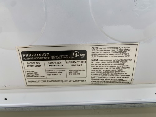 ONE (1) FRIGIDARE MICROWAVE, MODEL #FFCM1134LW, DIMENSIONS 10 IN. L X 12 IN. H X 13 1/2 IN. DEEP. NON-OPERATIONAL.