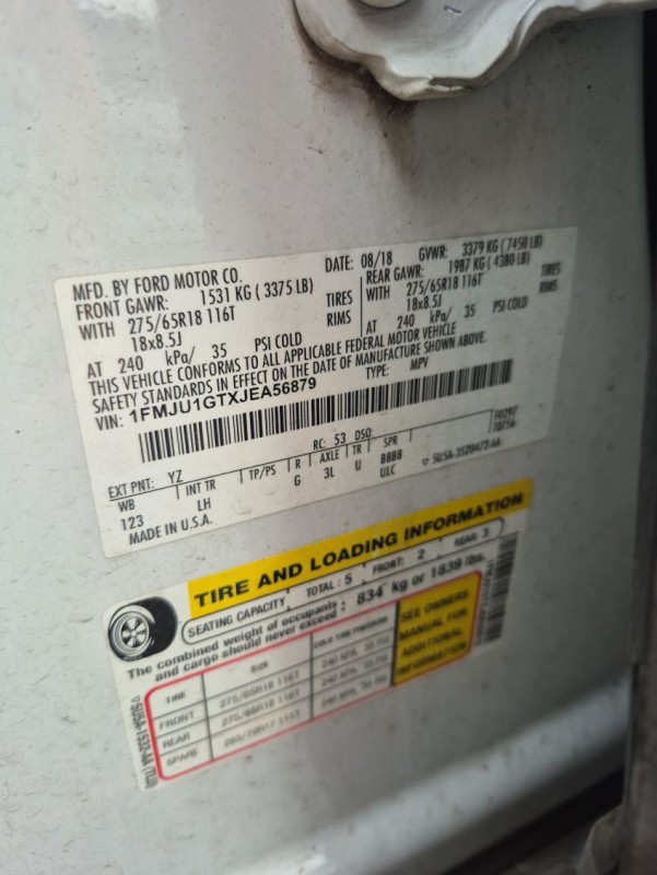 2018 FORD EXPEDITION - UNKNOWN IF THERE ARE ANY MECHANICAL ISSUES. MAY HAVE A/C, P/S, P/W, P/L, ABS, AM/FM, AUTOMATIC TRANSMISSION. OPTIONS MAY NOT WORK. THE ATTACHED PICTURES OR THIS DESCRIPTION MAY NOT INDICATE THE ACTUAL CONDITION OF THIS ITEM. WE DO NOT PROVIDE ASSISTANCE WITH TIRE INFLATION OR MECHANICAL ISSUES. VEHICLE MAY HAVE A DEAD BATTERY AND WILL NEED TO BE JUMPED TO START. POSSIBLE BENT FRAME