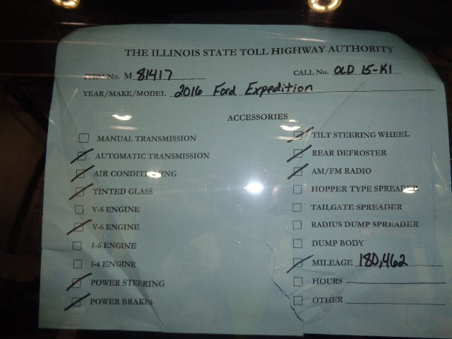 ILLINOIS TOLLWAY 2016 FORD EXPEDITION, 4WD, PREVIOUS K9 POLICE VEHICLE , V-6 TURBO ENGINE / VEHICLE AND INTERIOR ARE IN ROUGH CONDITION,ENGINE CAM PHASERS RATTLE, TURBOS ARE NOISY, NEEDS TIRES, EXHAUST MANIFOLDS LEAK AND VEHICLE NEEDS BRAKES. AM/FM RADIO, AUTO TRANSMISSION, MAY HAVE DENTS, SCRATCHES, PEELING PAINT & RUST NOT PICTURED AND HOLES WHERE EQUIPMENT WAS MOUNTED. . THIS VEHICLE HAS 180,463 MILES . THE ATTACHED PICTURES OR THIS DESCRIPTION MAY NOT INDICATE THE ACTUAL CONDITION OF THIS ITEM. THE VEHICLE LOT DRIVES