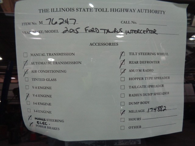 ILLINOIS TOLLWAY 2015 FORD TAURUS, AWD, POLICE INTERCEPTOR, V-6 ENGINE, GOOD CONDITION, BRAKES ARE NOISEY AND RUSTY FROM SITTING WILL NEED REPLACEMENT. VARIOUS RUST SPOTS ON VEHICLE RUNS AND LOT DRIVES . A/C, AM/FM RADIO, AUTO TRANSMISSION, MAY HAVE DENTS, SCRATCHES, PEELING PAINT & RUST NOT PICTURED AND HOLES WHERE EQUIPMENT WAS MOUNTED. . THIS VEHICLE HAS 174,882 MILES . THE ATTACHED PICTURES OR THIS DESCRIPTION MAY NOT INDICATE THE ACTUAL CONDITION OF THIS ITEM.
