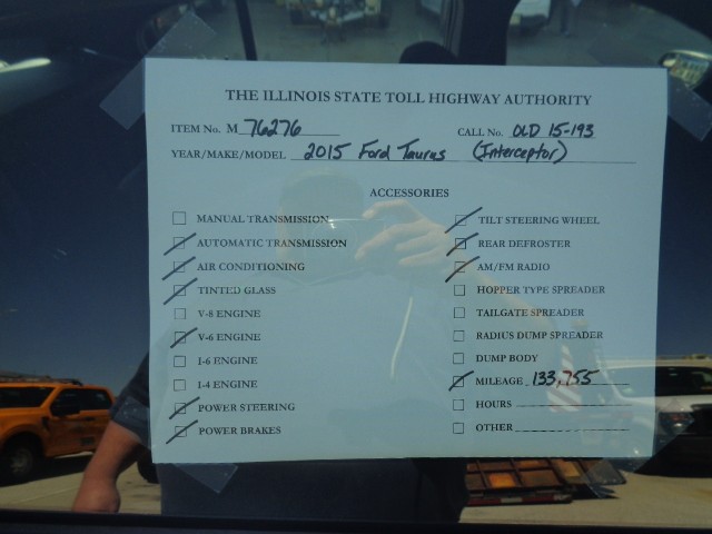 ILLINOIS TOLLWAY 2015 FORD TAURUS, AWD, POLICE INTERCEPTOR, V-6 ENGINE, GOOD CONDITION, BRAKES ARE NOISEY DUE TO RUST FROM SITTING, VEHICLE WILL NEED BRAKES DUE TO SITTING IN STORAGE, NEEDS BATTERY BUT WILL JUMP START, VARIOUS RUST SPOTS ON VEHICLE RUNS AND LOT DRIVES . A/C, AM/FM RADIO, AUTO TRANSMISSION, MAY HAVE DENTS, SCRATCHES, PEELING PAINT & RUST NOT PICTURED AND HOLES WHERE EQUIPMENT WAS MOUNTED. . THIS VEHICLE HAS 133,755 MILES . THE ATTACHED PICTURES OR THIS DESCRIPTION MAY NOT INDICATE THE ACTUAL CONDITION OF THIS ITEM.