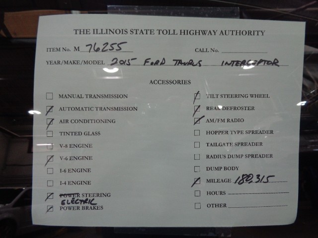 ILLINOIS TOLLWAY 2015 FORD TAURUS, AWD, POLICE INTERCEPTOR, V-6 ENGINE, GOOD CONDITION, BRAKES ARE NOISEY DUE TO RUST FROM SITTING, VEHICLE WILL NEED BRAKES DUE TO SITTING IN STORAGE, NEEDS BATTERY BUT WILL JUMP START, VARIOUS RUST SPOTS ON VEHICLE RUNS AND LOT DRIVES . A/C, AM/FM RADIO, AUTO TRANSMISSION, MAY HAVE DENTS, SCRATCHES, PEELING PAINT & RUST NOT PICTURED AND HOLES WHERE EQUIPMENT WAS MOUNTED. . THIS VEHICLE HAS 180,315 MILES . THE ATTACHED PICTURES OR THIS DESCRIPTION MAY NOT INDICATE THE ACTUAL CONDITION OF THIS ITEM.
