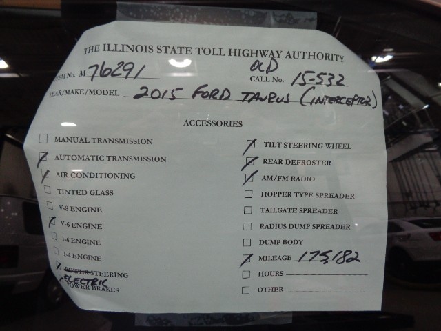 ILLINOIS TOLLWAY 2015 FORD TAURUS, AWD, POLICE INTERCEPTOR, V-6 ENGINE, GOOD CONDITION, BRAKES ARE NOISEY DUE TO RUST FROM SITTING, VEHICLE WILL NEED BRAKES DUE TO SITTING IN STORAGE, MAY NEED BATTERY BUT WILL JUMP START, WINDSHIELD CRACKED, DRIVERS SEAT HAS TEARS. VARIOUS RUST SPOTS ON VEHICLE RUNS AND LOT DRIVES . A/C, AM/FM RADIO, AUTO TRANSMISSION, MAY HAVE DENTS, SCRATCHES, PEELING PAINT & RUST NOT PICTURED AND HOLES WHERE EQUIPMENT WAS MOUNTED. . THIS VEHICLE HAS 175,181 MILES . THE ATTACHED PICTURES OR THIS DESCRIPTION MAY NOT INDICATE THE ACTUAL CONDITION OF THIS ITEM.