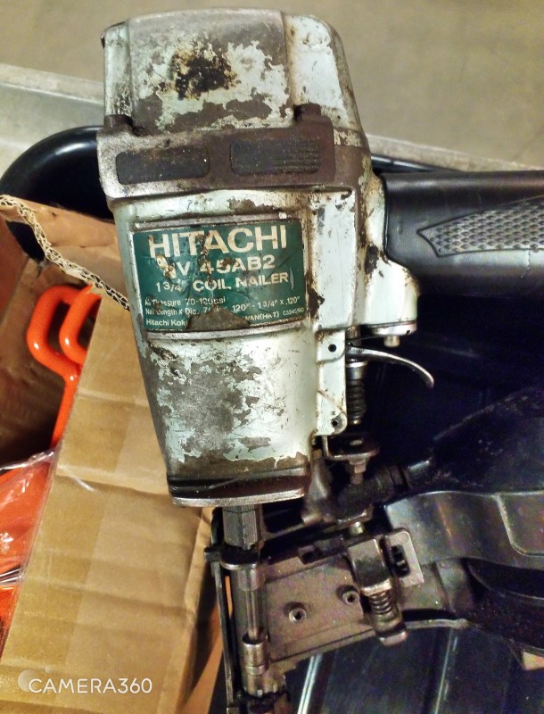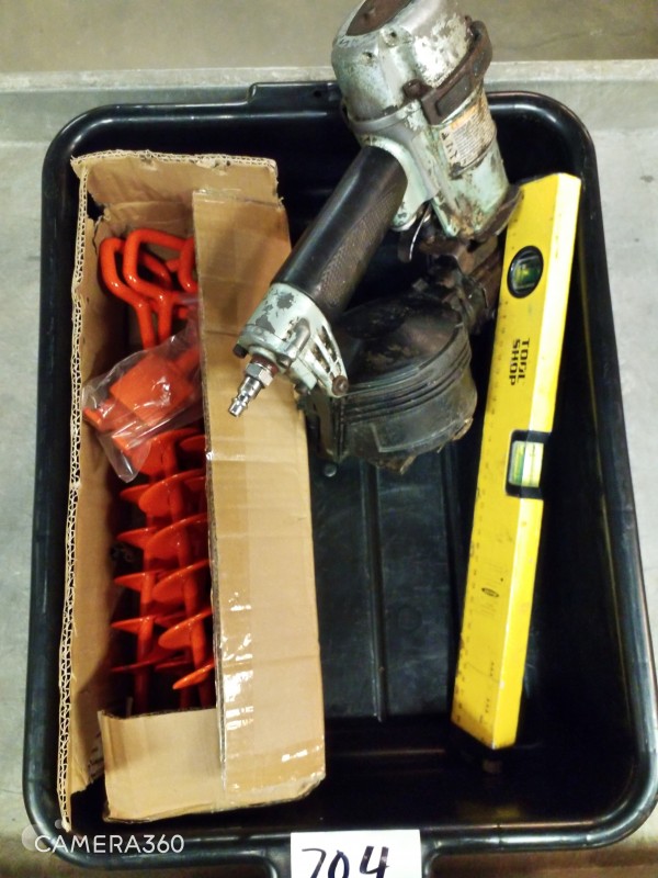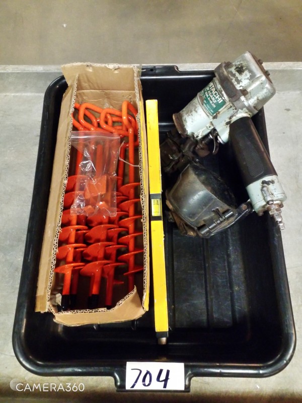 TSA HITACHI COIL NAILER, LEVEL, AND TENT STAKES (QTY 6)