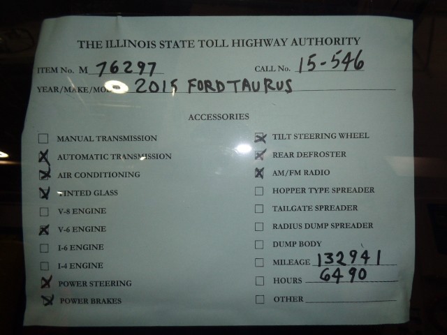 ILLINOIS TOLLWAY 2015 FORD TAURUS, AWD, POLICE INTERCEPTOR, V-6 ENGINE, GOOD CONDITION, BRAKES ARE NOISEY DUE TO RUST FROM SITTING MAY NEED BRAKES, MAY NEED BATTERY BUT WILL JUMP START, MAY NEED MUFFLER EXHAUST A LITTLE NOISEY, VEHICLE RUNS AND LOT DRIVES . A/C, AM/FM RADIO, AUTO TRANSMISSION, MAY HAVE DENTS, SCRATCHES, PEELING PAINT & RUST NOT PICTURED AND HOLES WHERE EQUIPMENT WAS MOUNTED. . THIS VEHICLE HAS 132,941 MILES . THE ATTACHED PICTURES OR THIS DESCRIPTION MAY NOT INDICATE THE ACTUAL CONDITION OF THIS ITEM.