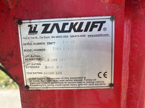 (1) ZACKLIFT 5TH WHEELER. MODEL# Z303K11. LIFT RATING RETRACTED 2,000#, LIFT RATING EXTENDED 15,000#. TOW RATING 85,000#. CONDITION UNKNOWN LAST USED 10 YEARS AGO, MAY NEED REPLACEMENT HOSES. MAY CONTAIN RUST, DAMAGE, SCRATCHES. EQUIPMENT MUST BE PICKED UP AT BIDDERS EXPENSE. APPOINTMENTS CAN BE MADE TO VIEW OR PICK UP MATERIAL BY CONTACTING ADAM ROWE (ROWEA@MWRD.ORG / 708-588-3367).