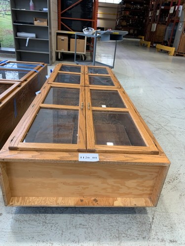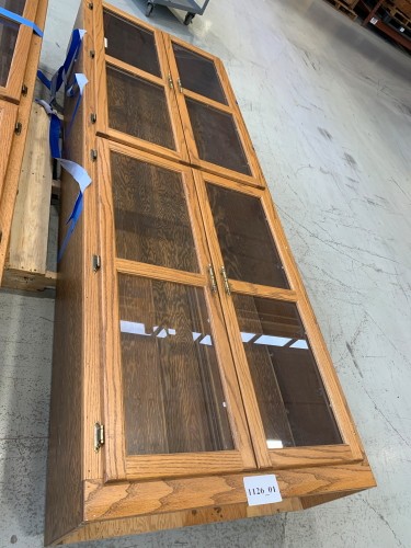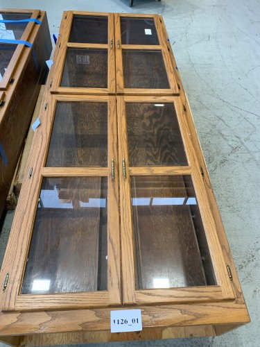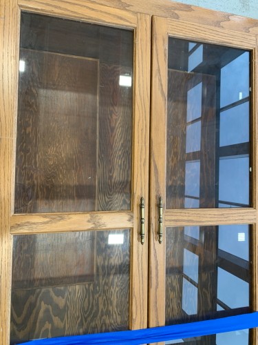 ONE (1) LARGE WOODEN GLASS CABINET, APPROXIMATE DIMENSIONS: 96 IN. HIGH X 34 IN. WIDE X 14-1/4 IN. DEEP.