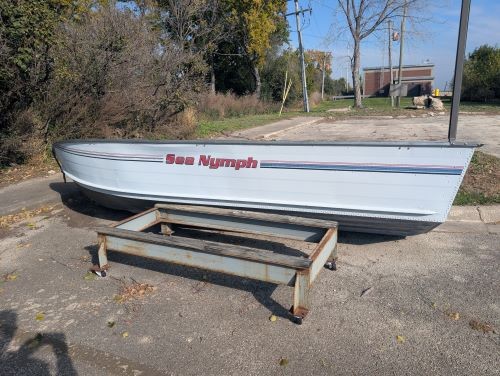 ALUMINUM BOAT. APPROX 16FT. MANUFACTURER: SEA NYMPH. SN# S4706. CONDITION UNKNOWN. BOAT IS SOLD WITH MISSING KEEL PLUG AND BOAT IS UPSIDE DOWN. MAY CONTAIN RUST, DAMAGE, SCRATCHES. EQUIPMENT MUST BE PICKED UP AT BIDDERS EXPENSE. APPOINTMENTS CAN BE MADE TO VIEW OR PICK UP MATERIAL BY CONTACTING ADAM ROWE (ROWEA@MWRD.ORG / 708-588-3367).