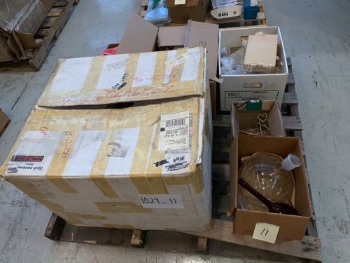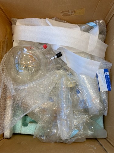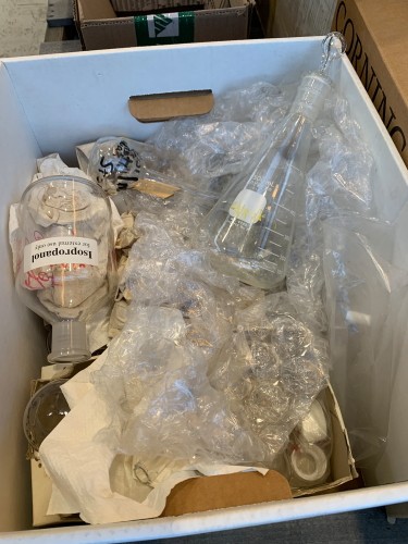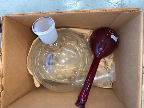 BOXES OF ASSORTED LAB MEASURING GLASSWARE AND SUPPLIES, KIMAX, CORNING, ETC., BOX OF CLAMPS FOR EXTRACTION GLASSWARE.