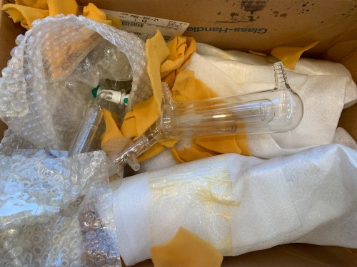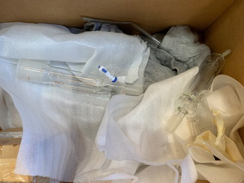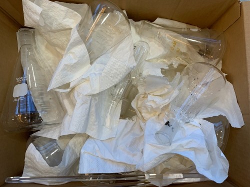 BOXES OF ASSORTED LAB MEASURING GLASSWARE AND SUPPLIES, KIMAX, CORNING, ETC.