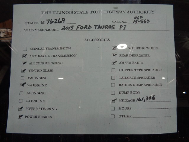 ILLINOIS TOLLWAY 2015 FORD TAURUS, AWD, POLICE INTERCEPTOR, V-6 ENGINE, GOOD CONDITION, BRAKE ROTORS RUSTY FROM SITTING ,WILL NEED BATTERY BUT WILL JUMP START, VEHICLE RUNS AND LOT DRIVES, MAY NEED TIRES, HAS RUST SPOTS ON ROOF . A/C, AM/FM RADIO, AUTO TRANSMISSION, MAY HAVE DENTS, SCRATCHES, PEELING PAINT & RUST NOT PICTURED AND HOLES WHERE EQUIPMENT WAS MOUNTED. . THIS VEHICLE HAS 161,306 MILES . THE ATTACHED PICTURES OR THIS DESCRIPTION MAY NOT INDICATE THE ACTUAL CONDITION OF THIS ITEM.