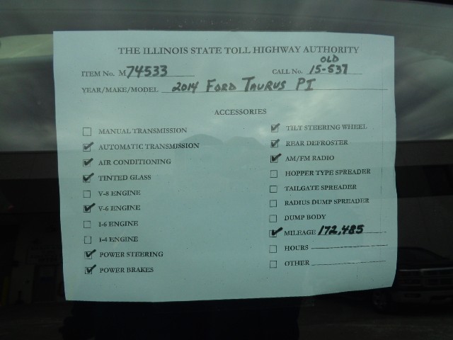 ILLINOIS TOLLWAY 2014 FORD TAURUS, AWD, POLICE INTERCEPTOR, V-6 ENGINE, GOOD CONDITION, BRAKE ROTORS RUSTY FROM SITTING ,WILL NEED BATTERY BUT WILL JUMP START, VEHICLE RUNS AND LOT DRIVES, MAY NEED TIRES, HAS RUST SPOTS ON ROOF . A/C, AM/FM RADIO, AUTO TRANSMISSION, MAY HAVE DENTS, SCRATCHES, PEELING PAINT & RUST NOT PICTURED AND HOLES WHERE EQUIPMENT WAS MOUNTED. . THIS VEHICLE HAS 174,485 MILES . THE ATTACHED PICTURES OR THIS DESCRIPTION MAY NOT INDICATE THE ACTUAL CONDITION OF THIS ITEM.