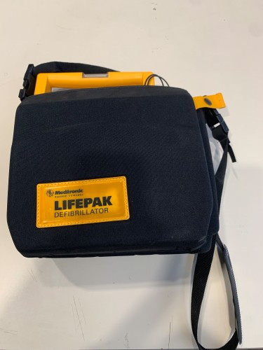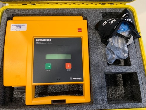 ONE (1) PHYSIO-CONTROL LIFEPAK 500 3D BIPHASIC IN HARD CASE, DOES NOT TURN ON, DISPLAY BATTERY SHOWS REPAIR WARNINGS.