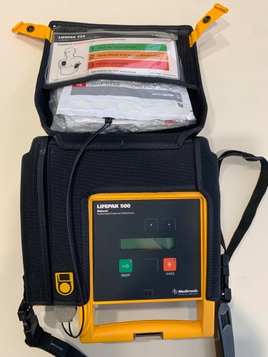 FOUR (4) PHYSIO-CONTROL LIFEPAK 500 3D BIPHASIC AED'S IN SOFT CASE, DOES NOT TURN ON, DISPLAY BATTERY SHOWS REPAIR WARNINGS.