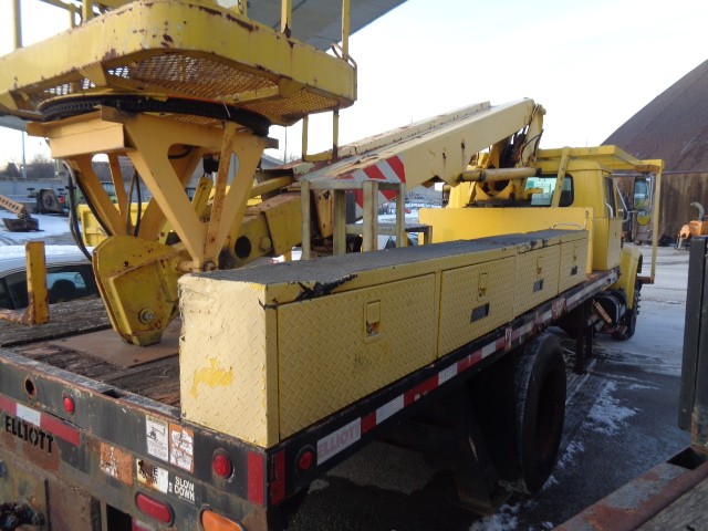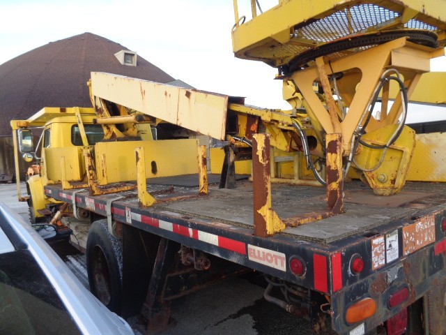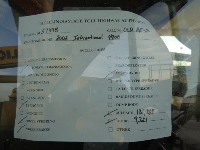 ILLINOIS TOLLWAY 2002 IH 4900W/ ELLIOT ECG-3-50NA LIFT KNAPHEIDE BODY, DT 466/ ALLISON AUTO TRANS, NEEDS BATTERIES , BUT WILL JUMP START , POOR CONDITION. VEHICLE DOES RUN BUT NEEDS A SHOT OF ETHER TO INITIALLY START BUT AFTER THAT STARTS FINE. LIFT DOES OPERATE STRUCTURE AND OUTRIGGERS VERY RUSTY/ROTTED. VEHICLE WILL NEED WORK BE TO BE USEFUL. POOR SHAPE BEEN SITTING FOR A FEW YEARS. VEHICLE SHOULD BE INSPECTED BEFORE BIDDING. A/C, AM/FM RADIO, AUTO TRANS. MAY HAVE DENTS, SCRATCHES, PEELING PAINT & RUST NOT PICTURED AND HOLES WHERE EQUIPMENT WAS MOUNTED . VEHICLE HAS 131,189 MILES AND 9,721 HOURS. THE ATTACHED PICTURES OR THIS DESCRIPTION MAY NOT INDICATE THE ACTUAL CONDITION OF THIS ITEM.