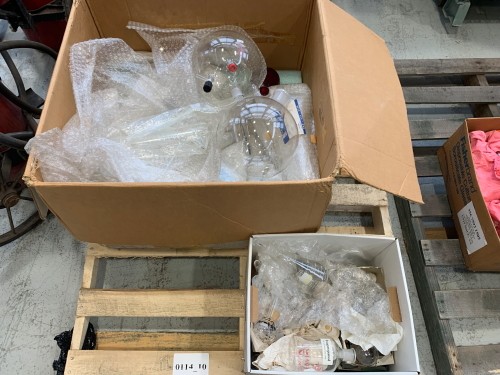 ONE (1) BOX OF ASSORTED LAB MEASURING GLASSWARE.