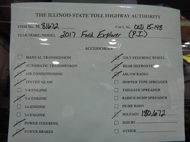 ILLINOIS TOLLWAY 2017 FORD EXPLORER, 4WD, 3.7L V-6 ENGINE, GOOD CONDITION. A/C, AM/FM RADIO, AUTO TRANS. MAY NEED BRAKES RUSTY FROM SITTING,MAY NEED A BATTERY BUT WILL JUMP START, CORROSION ON HOOD VEHICLE RUNS AND LOT DRIVES MAY HAVE DENTS, SCRATCHES, PEELING PAINT & RUST NOT PICTURED AND HOLES WHERE EQUIPMENT WAS MOUNTED. THIS VEHICLE HAS 180,519 MILES. THE ATTACHED PICTURES OR THIS DESCRIPTION MAY NOT INDICATE THE ACTUAL CONDITION OF THIS ITEM.
