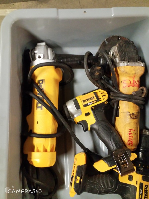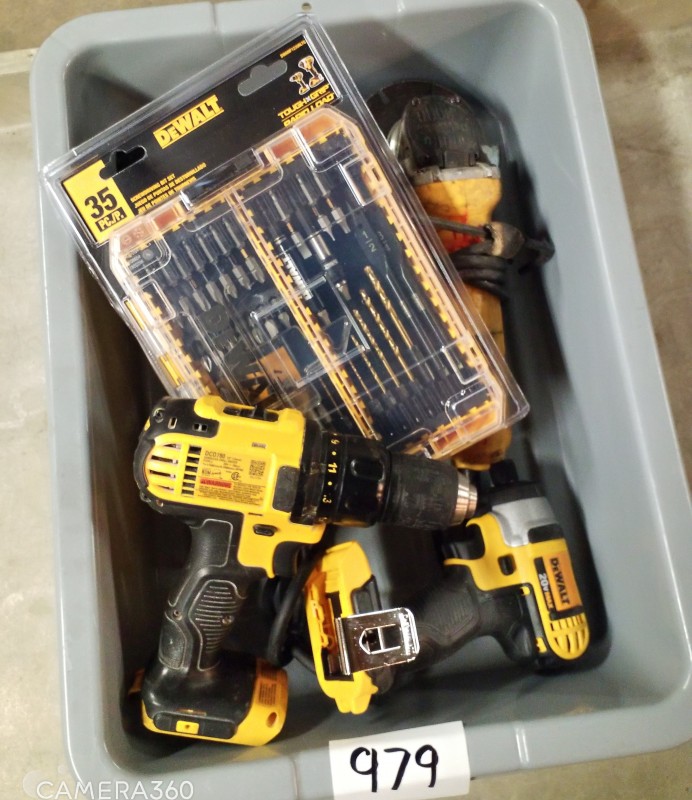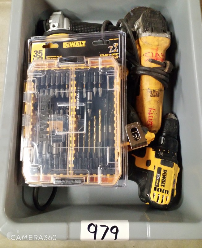 ASSORTED DEWALT TOOLS - DRILL IMPACT DRIVER DRILL DRIVER, ANGLE GRINDERS,& SCREWDRIVING BIT SET