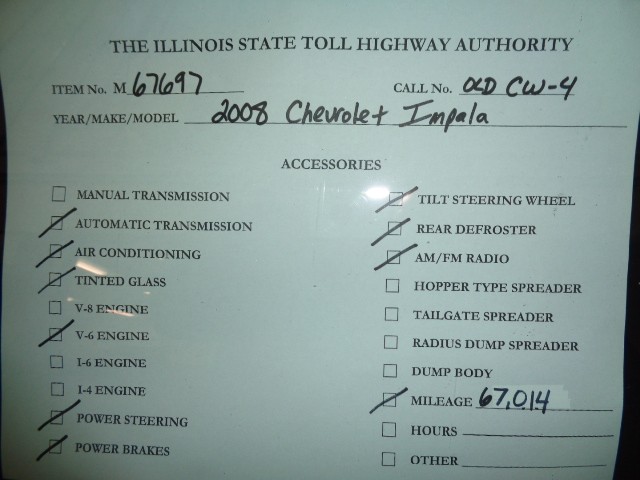 ILLINOIS TOLLWAY 2008 CHEVY IMPALA 3.5L V-6 ENGINE Automatic Transmission,GOOD CONDITION, A/C, AM/FM RADIO. MAY NEED BATTERY BUT JUMP STARTS, RUNS AND DRIVES. MAY HAVE DENTS, SCRATCHES, PEELING PAINT & RUST NOT PICTURED AND HOLES WHERE EQUIPMENT WAS MOUNTED. THIS VEHICLE RUNS AND DRIVES. THIS VEHICLE HAS 67,017 MILES. THE ATTACHED PICTURES OR THIS DESCRIPTION MAY NOT INDICATE THE ACTUAL CONDITION OF THIS ITEM.