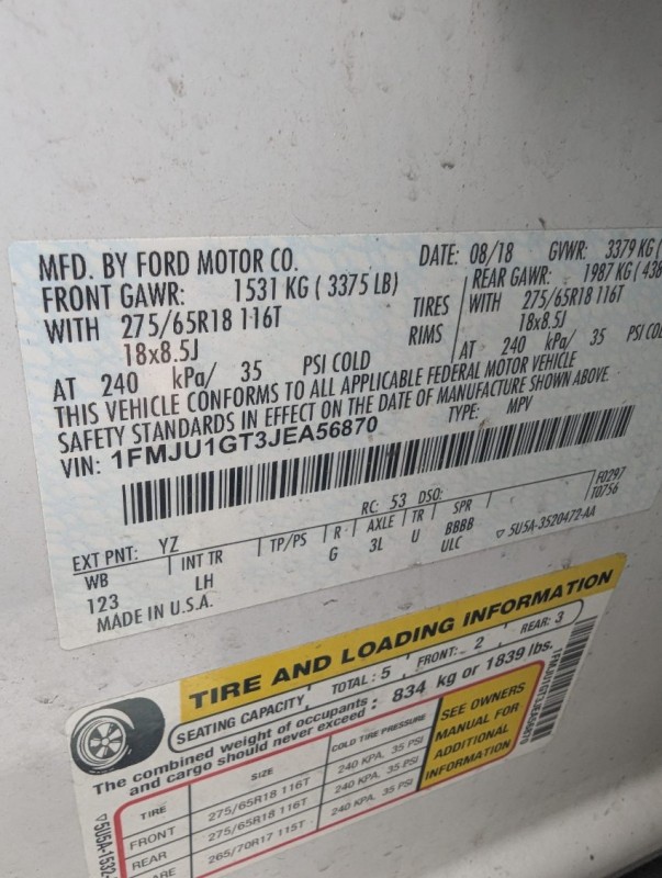 2018 Ford Expedition - UNKNOWN IF THERE ARE ANY MECHANICAL ISSUES. MAY HAVE A/C, P/S, P/W, P/L, ABS, AM/FM, AUTOMATIC TRANSMISSION. OPTIONS MAY NOT WORK. THE ATTACHED PICTURES OR THIS DESCRIPTION MAY NOT INDICATE THE ACTUAL CONDITION OF THIS ITEM. WE DO NOT PROVIDE ASSISTANCE WITH TIRE INFLATION OR MECHANICAL ISSUES. VEHICLE MAY HAVE A DEAD BATTERY AND WILL NEED TO BE JUMPED TO START.