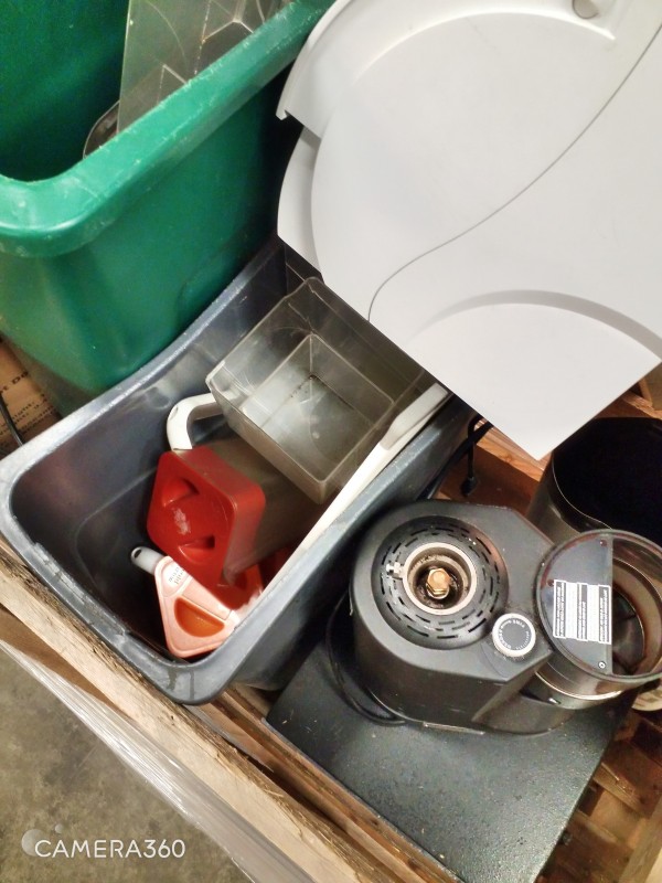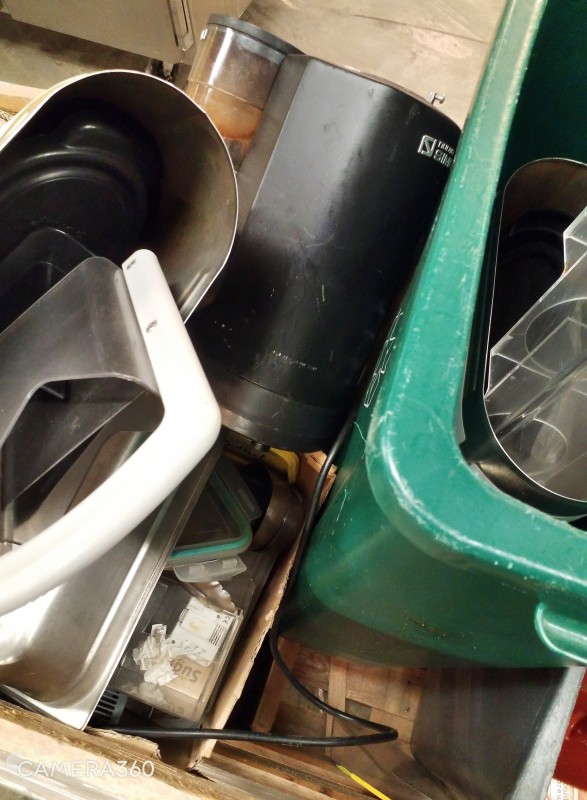 PALLET OF MISCELLANEOUS ITEMS - COIN SORTER, BILL COUNTER, SMALL SAFE, VARIOUS FOOD PROCESSING ITEMS/UTENSILS