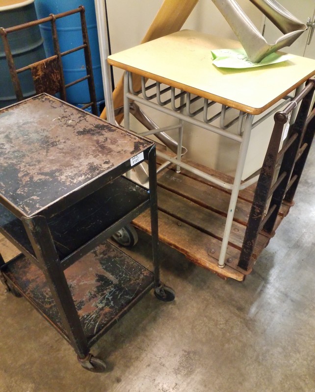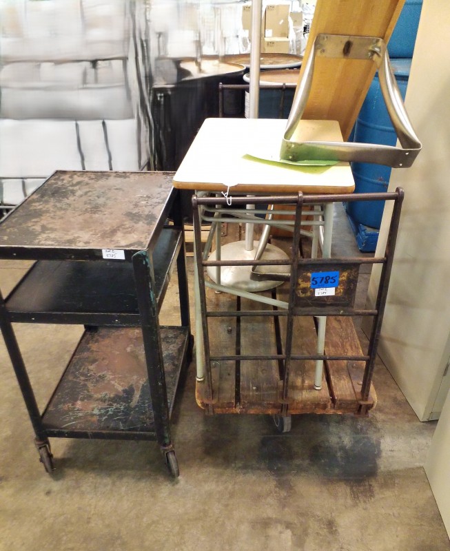 TWO ROLLING CARTS, SMALL TABLE & BENCH, & COAT/HAT RACK