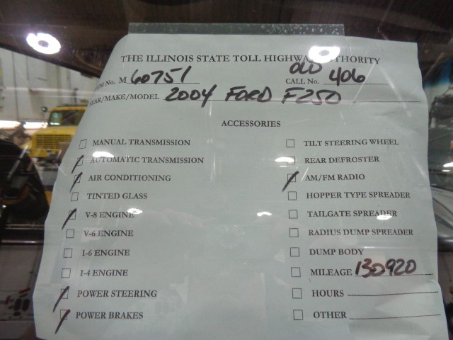 ILLINOIS TOLLWAY 2004 FORD F250 2WD PICK-UP TRUCK, 5.4 L V-8 ENGINE, FAIR CONDITION, POWER STEERING, BRAKES, AM/FM RADIO, AUTO TRANS. CHARGE LIGHT IS ON. UNKNOWN WORKING CONDITION. VERY RUSTY ESPECIALLY UNDER NEATH SUGGEST TO TOW AWAY. SHOULD BE VIEWED BEFORE BIDDING RUNS AND LOT DRIVES UNKNOWN IF ROAD WORTHY. MAY HAVE DENTS, SCRATCHES, PEELING PAINT & RUST NOT PICTURED AND HOLES WHERE EQUIPMENT WAS MOUNTED. THIS TRUCK RUNS & DRIVES. THIS TRUCK HAS 130,920 MILES. THE ATTACHED PICTURES OR THIS DESCRIPTION MAY NOT INDICATE THE ACTUAL CONDITION OF THIS ITEM.