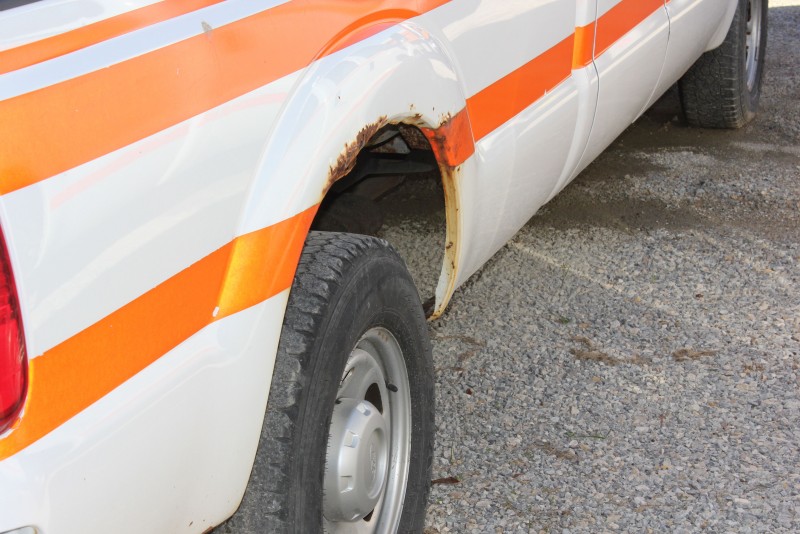 Paint is likely in overall poor condition, with peeling and fading. Dents, dings, and scratches as consistent with vehicle age, mileage and use or worse. Rust may or may not appear on several areas around the vehicle. May or may not have undercarriage or structural rust damage. Decal and sticker remnants may remain on paint. Other paint flaking and surface rust may be present. There may be holes from removal of communication antennas and equipment.