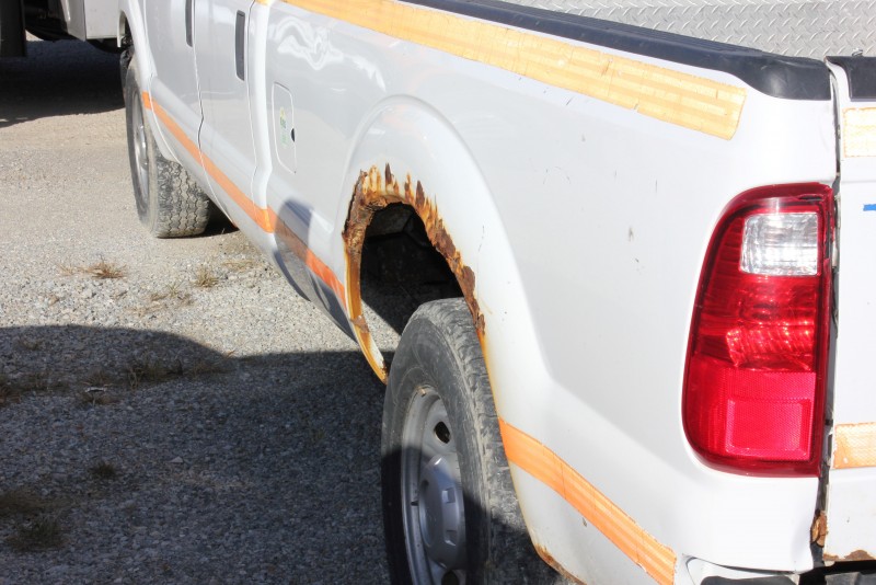 Paint is likely in overall poor condition, with peeling and fading. Dents, dings, and scratches as consistent with vehicle age, mileage and use or worse. Rust may or may not appear on several areas around the vehicle. May or may not have undercarriage or structural rust damage. Decal and sticker remnants may remain on paint. Other paint flaking and surface rust may be present. There may be holes from removal of communication antennas and equipment.